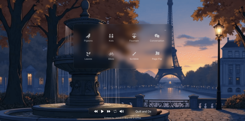A rotating carousel of ambient worlds inspired by Netflix’s You — from dusty bookstores and California kitchens to velvet clubs and Parisian farewells. This all-in-one widget brings together six immersive soundboards, each with ambient textures and cinematic music to match the scene. Switch between moods without leaving your Notion page.